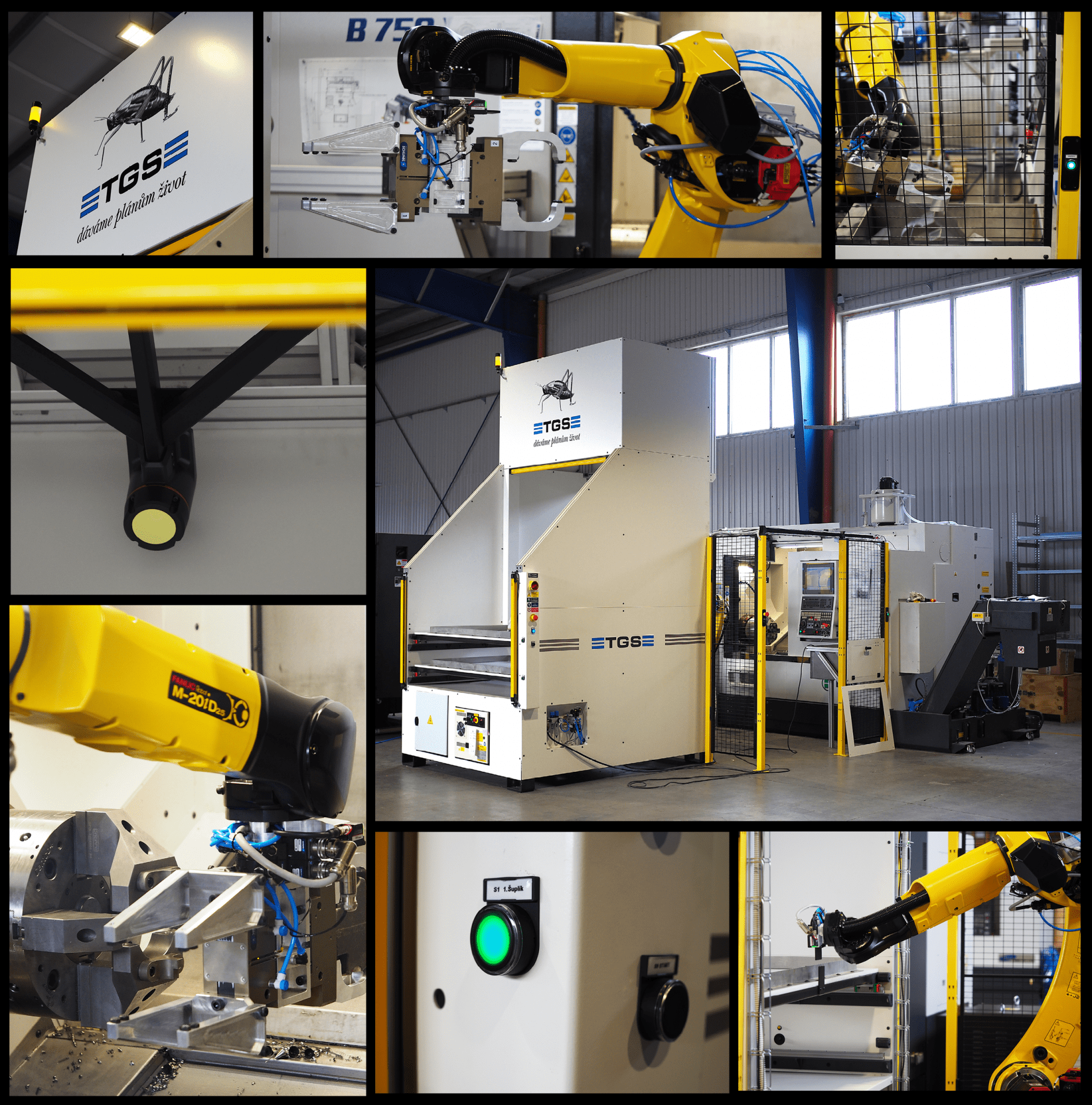 - Druhá, umístěná na robotu, kontroluje správné založení dílce do stroje.